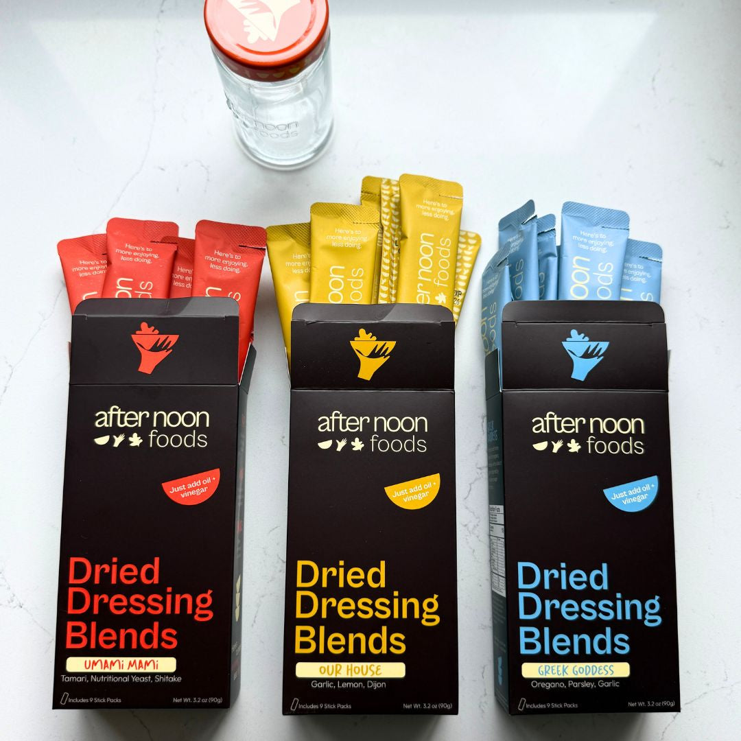 Try all three flavors of our dried dressing blends in a box ready to gift for the holidays! Homemade-ish dressing ready in 1 minute, just add oil and vinegar, shake, and pour on everything.
